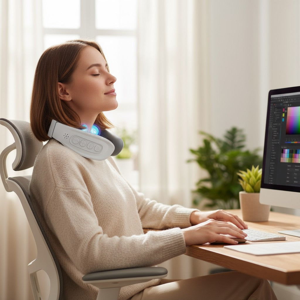 Nuestro masajeador cervical inteligente alivia esa presión en minutos mediante impulsos suaves y calor terapéutico.